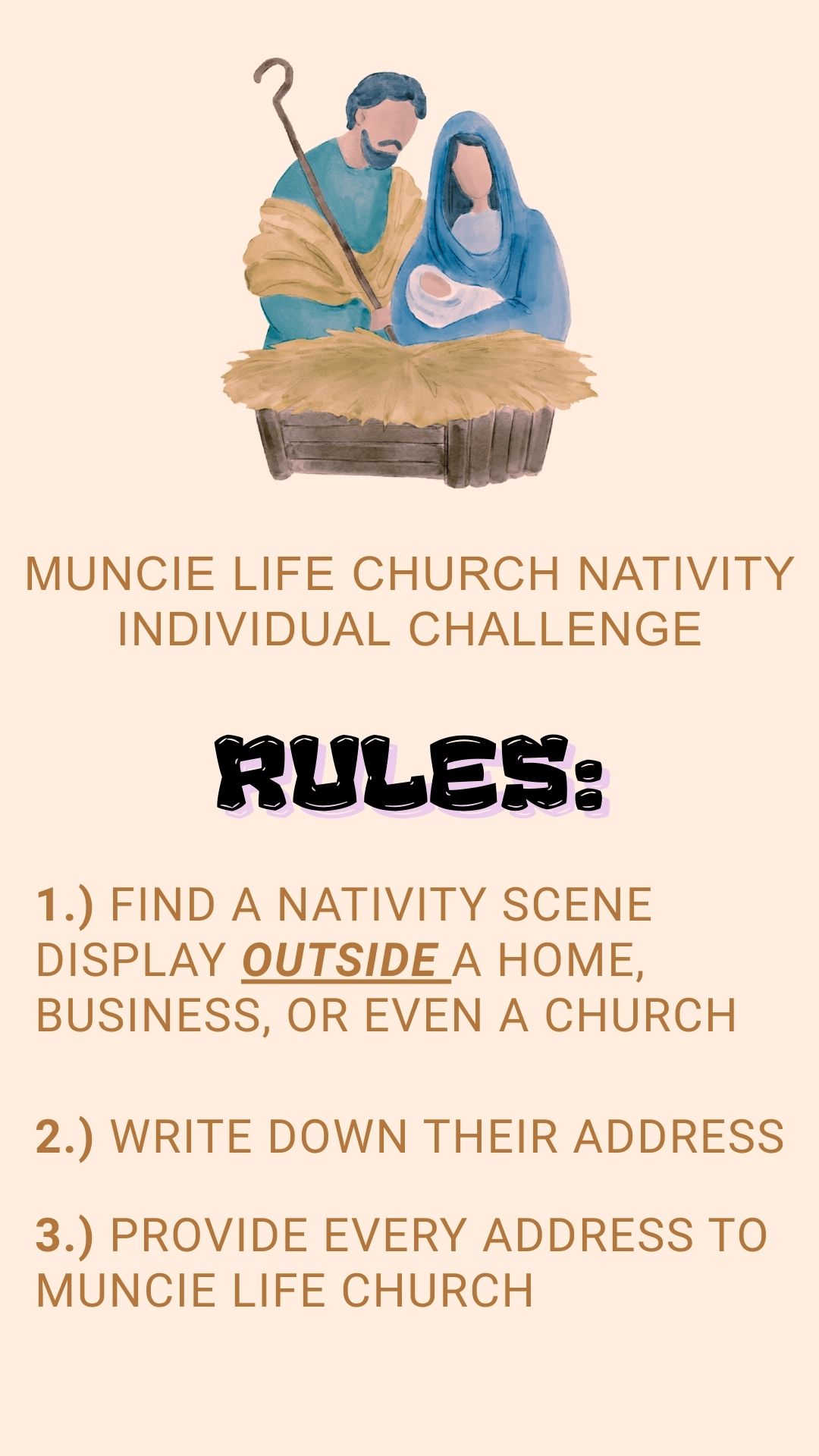 When you see a Nativity scene at home, at work, or even at church. Write down every address you see to Muncie Life Church so you can get the credit. Rooftops are good too.